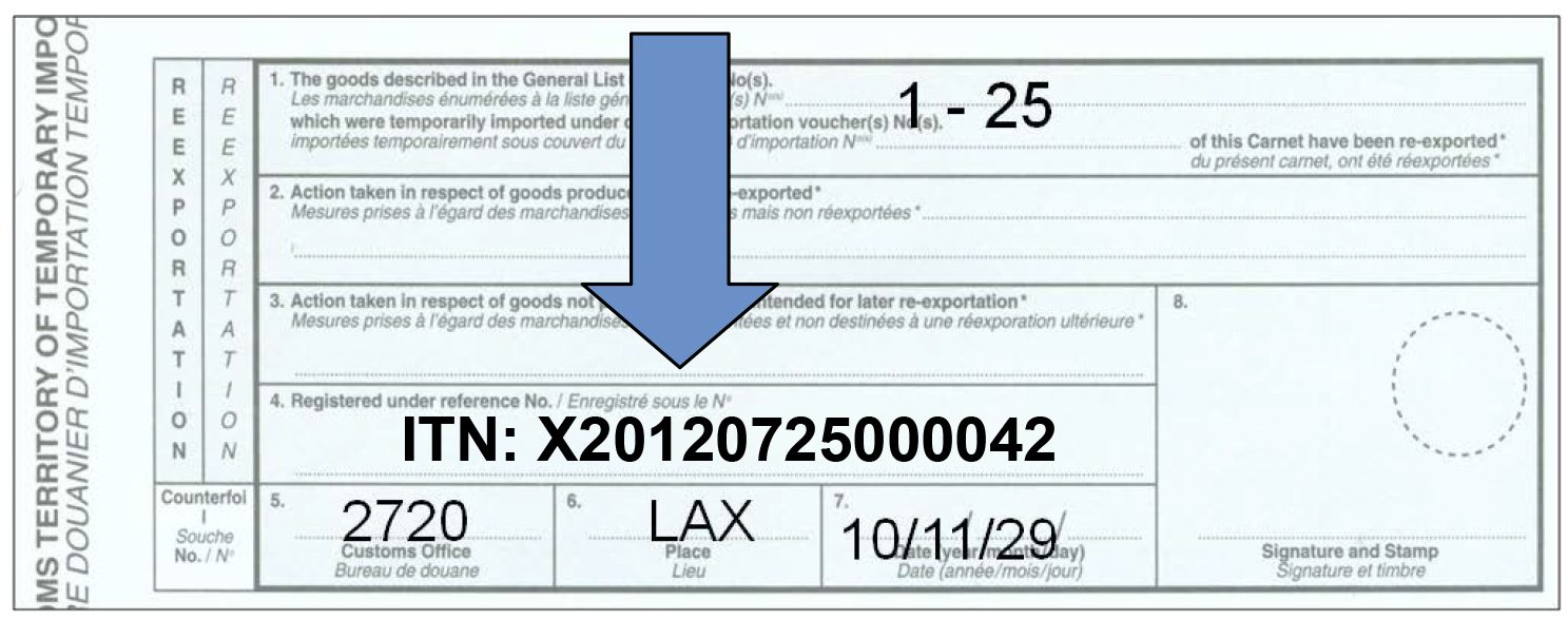 Once the EEI filing is submitted, you will receive an email confirmation containing your unique Internal Transaction Number (ITN). This must be recorded on the exportation counterfoil in the box 3 for “Other remarks” (U.S. ATA Carnet) or box 4 “Registered under reference No.” (foreign ATA Carnet).  |