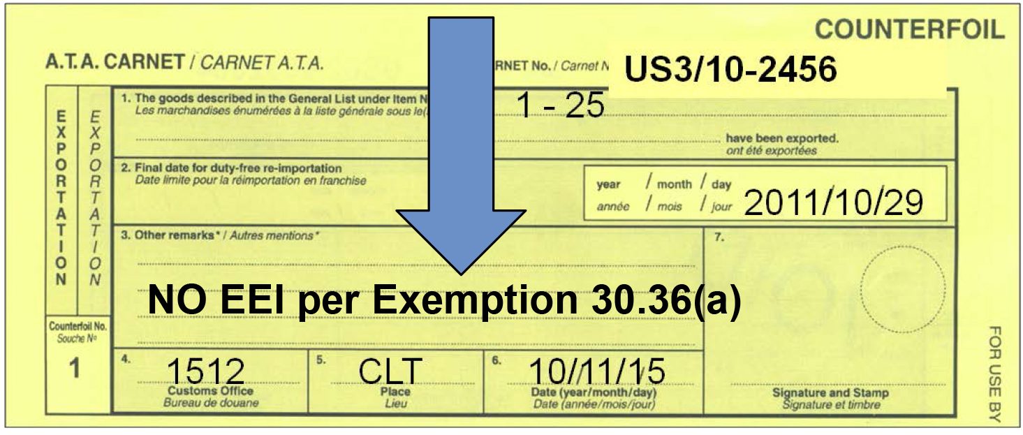 This exemption only applies to U.S.-issued ATA Carnets. Foreign ATA Carnets that are being hand carried must still fulfill the EEI filing requirement if any Schedule B number’s total value exceeds $2,500. For items traveling with an export licenses certain restrictions still apply. (see 15 CFR 740.9). To benefit from the Hand Carried Tools of the Trade exemption, enter into box 3 for “Other remarks” the following: NO EEI per Exemption 30.37(b)  |