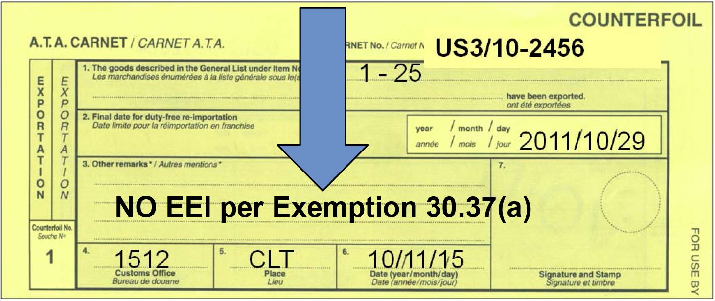 This exemption needs to be recorded on the yellow exportation counterfoil in box 3 for “Other remarks” as: NO EEI per Exemption 30.37(a)  |